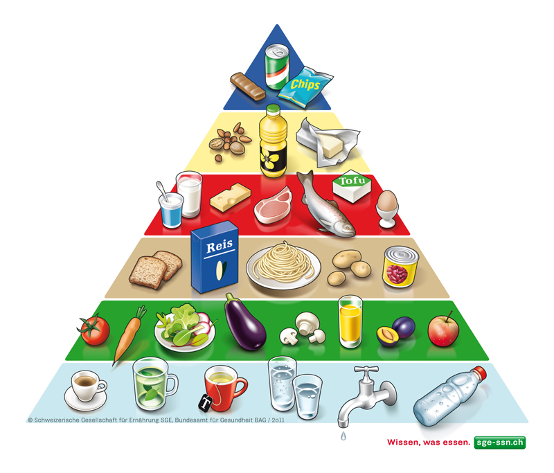 Die Ernährungspyramide der Schweizerischen Gesellschaft für Ernährung illustriert eine ausgewogene Ernährung. Im unteren breiten Teil der Pyramide befinden sich die Nahrungsmittel, welche bevorzugt konsumiert werden sollten, im oberen Teil (Spitze) finden wir die Nahrungsmittel, welche mit Zurückhaltung genossen werden sollten.