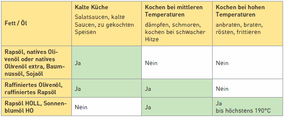 In einer ausgewogenen Ernährung ist das richtige Verhältnis dieser Fettsäuren wichtig, wobei gewisse ungesättigte Fettsäuren – nämlich die Omega- 3-Fettsäuren – speziell zu beachten sind. Es wird empfohlen, bevorzugt Öle mit hohem Gehalt an Omega-3-Fettsäuren (Rapsöl, Nussöl, Sojaöl) und an einfach ungesättigten Fettsäuren (Olivenöl, High oleic Sonnenblumenöl) zu verwenden.
